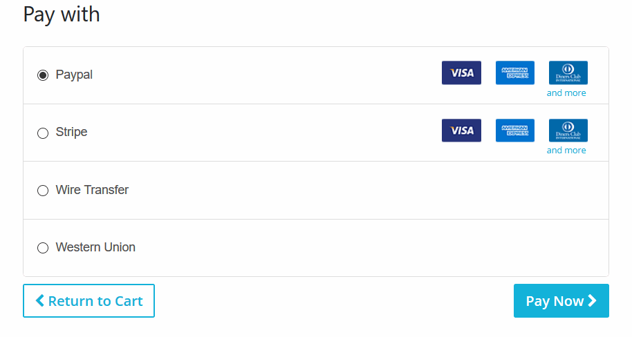 Payment Methods: PayPal, Strip, Western Union, Wire Transfer